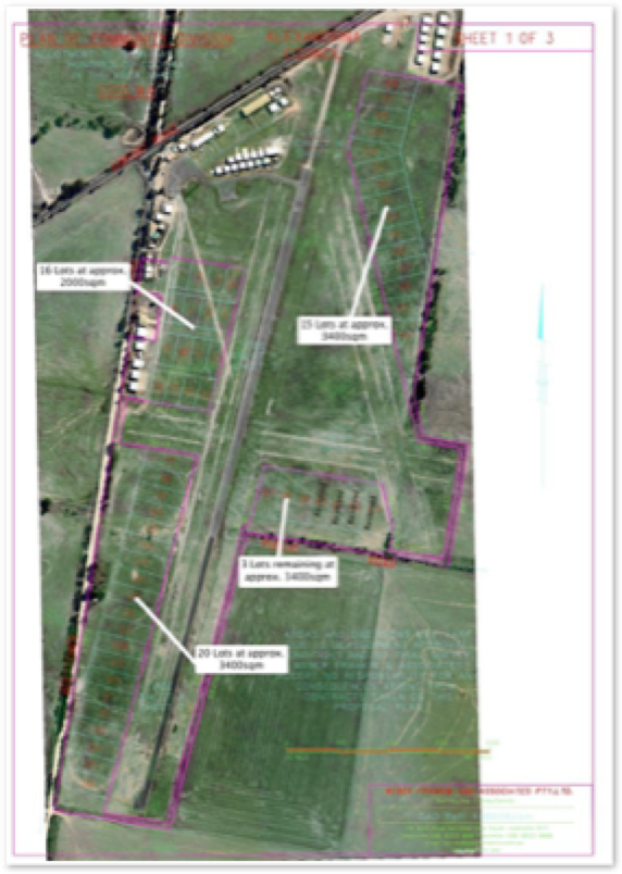 The Master Plan has a total of 58 residential lots in a Community Title ranging from approximately 2000 sqm. to 3400 sqm. arranged around the runways . A perimeter road services the blocks with areas of park land and native vegetation dispersed around the edges. The north area along Airport Road is reserved for commercial activity and the north east corner is reserved for private hangars only.
